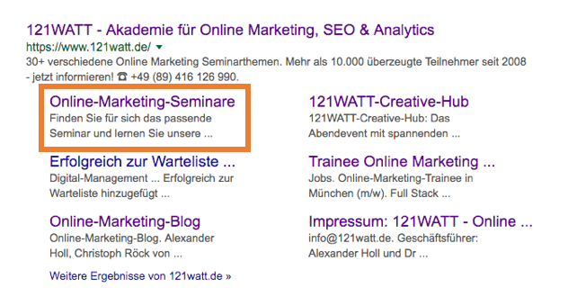 • Für die Expanded Sitelinks verwendet Google meist Seiten, die im Hauptmenü vorkommen oder die intern besonders häufig verlinkt sind.