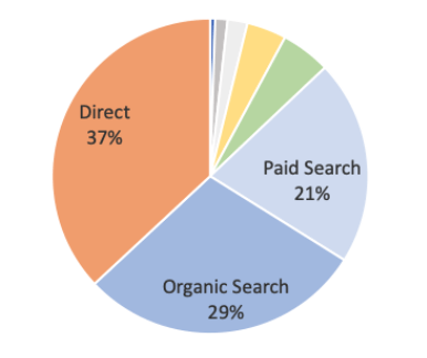 Wir haben die größten deutschen Webseiten nach Traffic-Herkunft analysiert. Die wichtigsten Kanäle waren “Direct”, organische Suche und bezahlte Suche. Eine 2021 veröffentliche Studie, die eine Vielzahl von Webseiten untersuchte kam zu einem ähnlichen Ergebnis: Die Top 2 Trafficquellen waren Search (organische Suche und bezahlte Suche zusammengefasst) und Direct.
