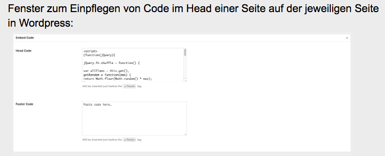Da wir keine Software-Entwickler sind, habe ich das testweise über das Plugin Embed Code realisiert. Langfristig wird das aber wieder ausgebaut. Durch dieses Plugin erscheint unter jeder Seite in WordPress ein Fenster, über das wir den JS-Code zur zufälligen Sortierung der Antwortoptionen eingepflegt haben. Die Integration über das (andere) “Code-Embed”-Plugin wird hier beschrieben.