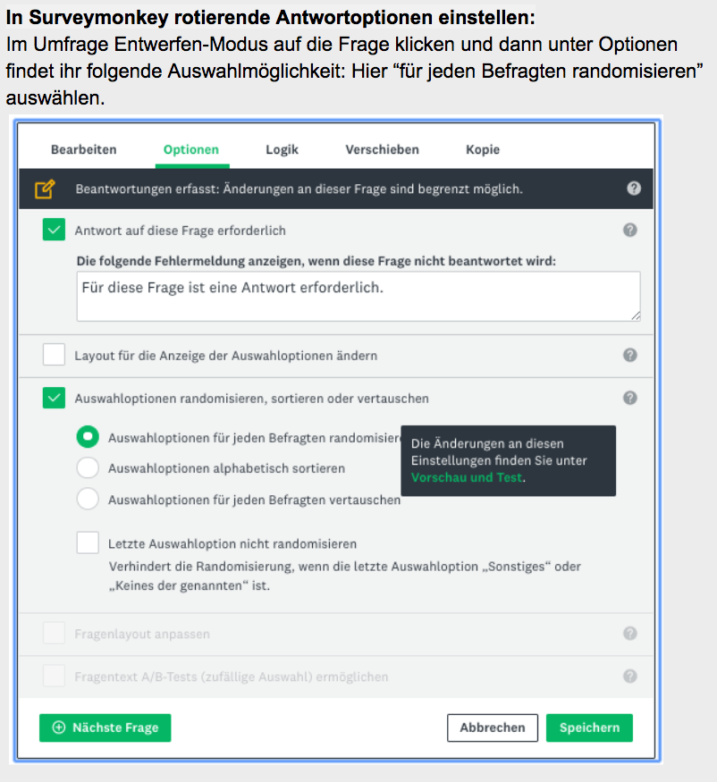 Wie eine Rotation der Antwortoptionen bei Surveymonkey und Surveygizmo vorgenommen wird, seht ihr hier: