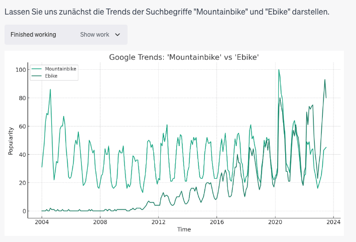 Prompt 1: Ich habe hier eine Liste aus Google Trends. Ich möchte hier auf der einen Seite die Begriffe Mountainbike und Ebike miteinander vergleichen. Wie haben sich diese Begriffe entwickelt und gibt es eine Korrelation auf der anderen Seite zu den drei Marken Specialized, Canyon und Cannondale?