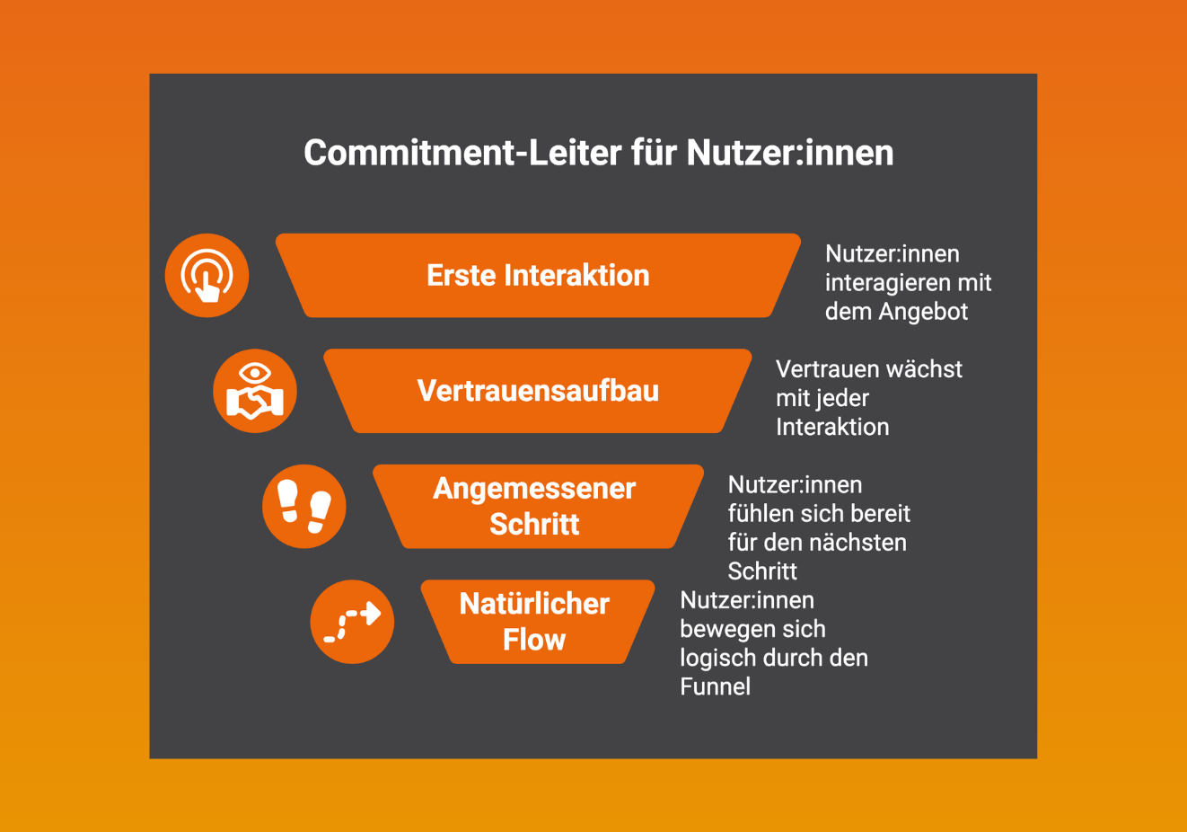 Um diese Lücke zu verstehen, hilft das einfache Modell der Commitment-Leiter. Es beschreibt, dass Nutzer:innen sich nicht abrupt für oder gegen ein Angebot entscheiden, sondern sich schrittweise annähern.