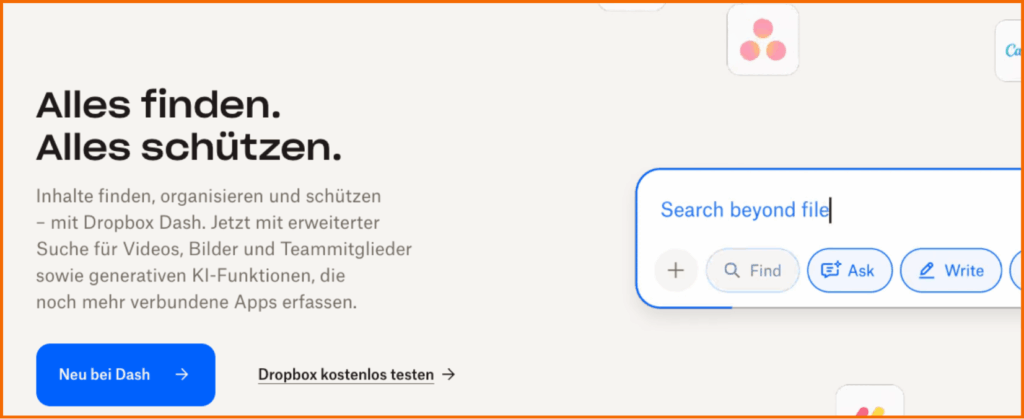 Nur eine einzelne Botschaft pro Satz, bekannte Begriffe, saubere Struktur. Leichte Texte wirken vertrauter und um vielfaches glaubwürdiger. Wie hier auf der Startseite von Dropbox.