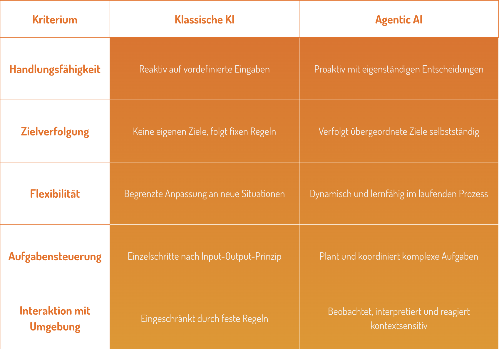 Die folgende Tabelle zeigt zentrale Unterschiede zwischen klassischer KI und Agentic AI:
