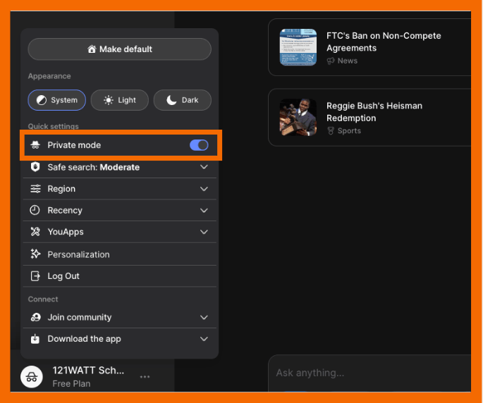 So kannst du den Modus aktivieren: Klicke auf die drei Punkte neben deinem Benutzer-Avatar in der linken unteren Ecke der You.com-Oberfläche und schalte den Privatmodus ein: