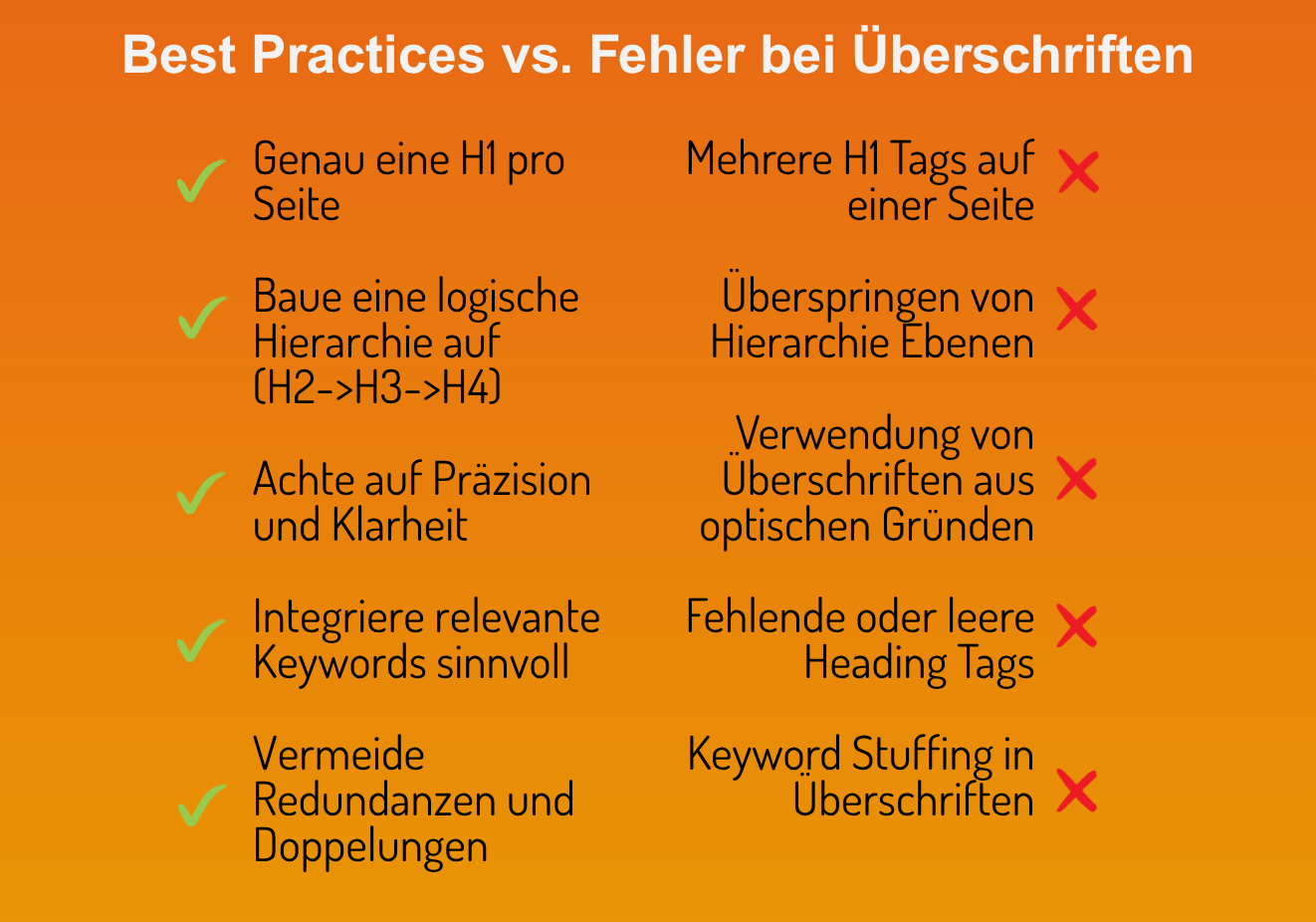 Gut strukturierte Überschriften sind kein Nice-to-have, sondern ein zentrales Element für erfolgreiche Inhalte. Sie verbessern die Lesbarkeit, erleichtern die Navigation und liefern Google wertvolle Signale zur Relevanz und Gliederung deiner Inhalte. Damit das gelingt, solltest du beim Einsatz von Heading Tags folgende Best Practices beachten: