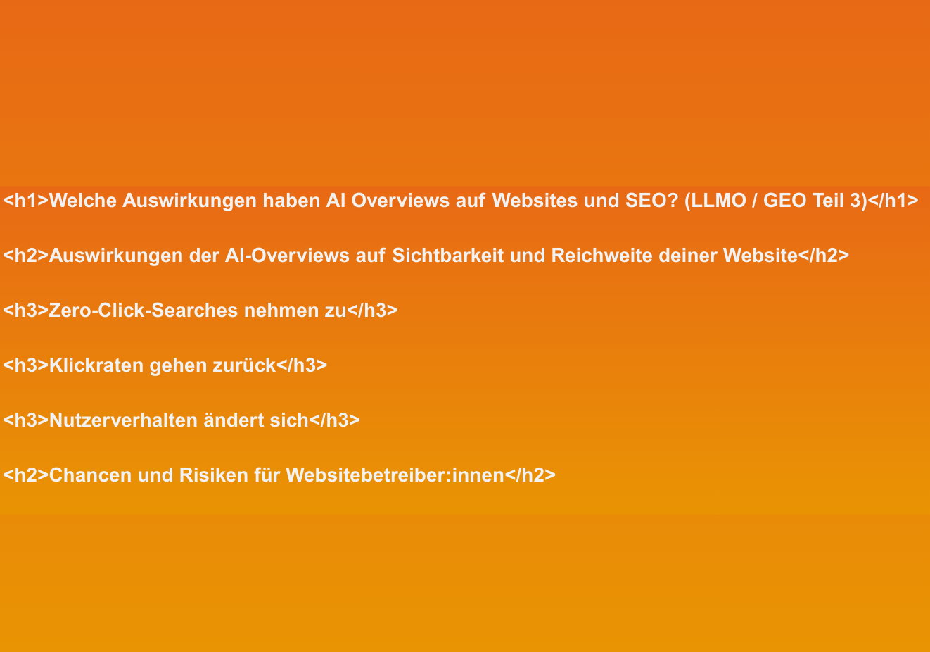 Wenn wir über Überschriften sprechen, ist es wichtig zu unterscheiden: „Headings“ meint die inhaltlichen Überschriften eines Textes, also das, was Leser:innen auf der Seite sehen. „Heading Tags“ hingegen sind die technischen HTML-Elemente, die diese Überschriften für den Code auszeichnen, von <h1> bis <h6>. Nur wenn Headings auch korrekt mit Heading Tags ausgezeichnet sind, können Suchmaschinen die Struktur einer Seite vollständig verstehen und bewerten.