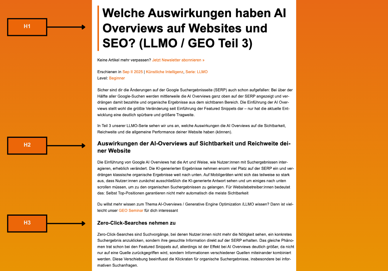 Die Gliederung deiner Inhalte sollte sich in den Überschriften widerspiegeln. Hauptabschnitte bekommen H2-Tags, deren Unterpunkte H3, und so weiter. Diese Struktur sollte auch über verschiedene Seiten hinweg konsistent sein. Wer sauber hierarchisiert, hilft Nutzer:innen beim Scannen und Suchmaschinen beim Verstehen der Themenbezüge.
