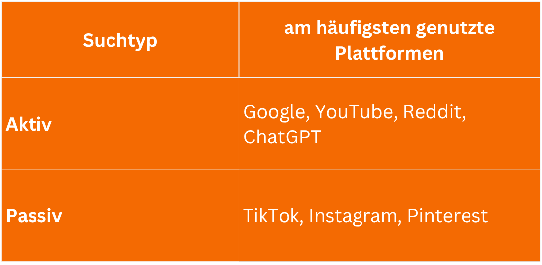 Plattformen, auf denen aktive Suche stark stattfindet, sind z. B. Google, YouTube, Foren, KI-Tools wie ChatGPT.