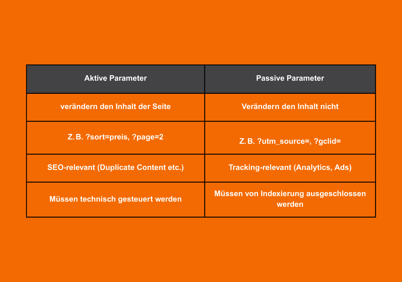 Nicht alle URL-Parameter funktionieren gleich und nicht alle haben Auswirkungen auf den Seiteninhalt. Grundsätzlich lassen sich Parameter in zwei Kategorien einteilen: aktive und passive Parameter.